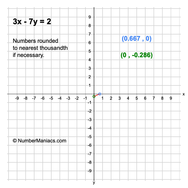 We will start by calculating and showing you the solution for the x-intercept and y-intercept of 3x - 7y = 2.