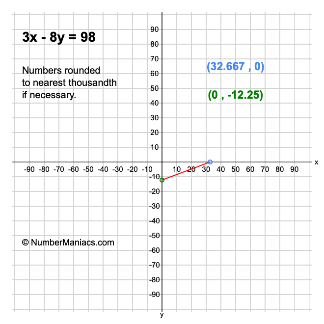 We will start by calculating and showing you the solution for the x-intercept and y-intercept of 3x - 8y = 98.