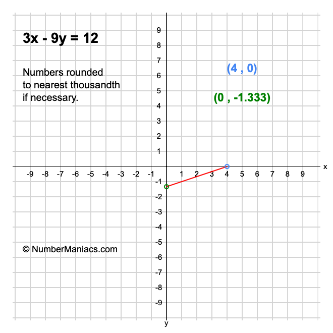 We will start by calculating and showing you the solution for the x-intercept and y-intercept of 3x - 9y = 12.