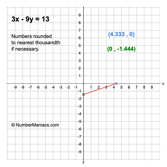 We will start by calculating and showing you the solution for the x-intercept and y-intercept of 3x - 9y = 13.
