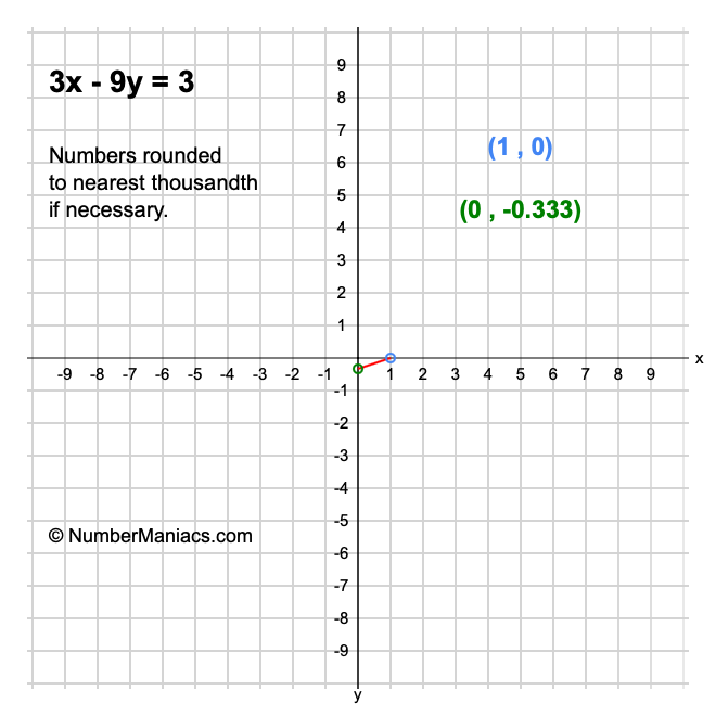 Thus, we use the x-intercept and y-intercept results above to get the graph plots for 3x - 9y = 3 as follows: