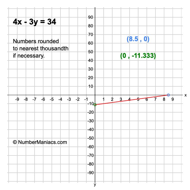 We will start by calculating and showing you the solution for the x-intercept and y-intercept of 4x - 3y = 34.