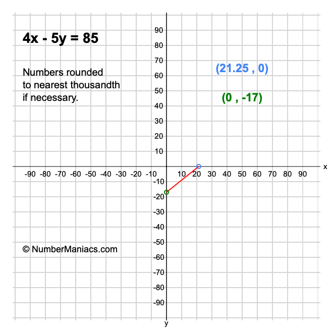 We will start by calculating and showing you the solution for the x-intercept and y-intercept of 4x - 5y = 85.
