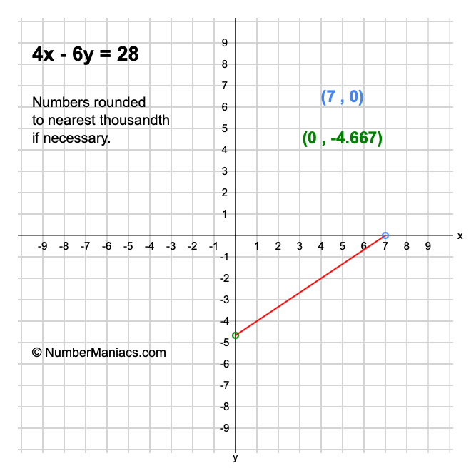 We will start by calculating and showing you the solution for the x-intercept and y-intercept of 4x - 6y = 28.