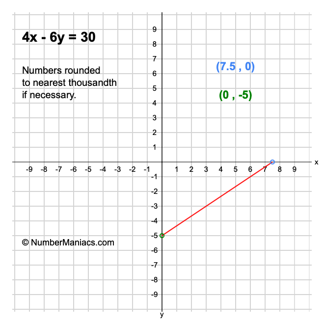 We will start by calculating and showing you the solution for the x-intercept and y-intercept of 4x - 6y = 30.
