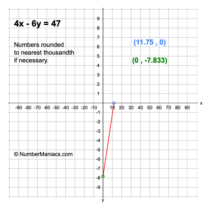 We will start by calculating and showing you the solution for the x-intercept and y-intercept of 4x - 6y = 47.