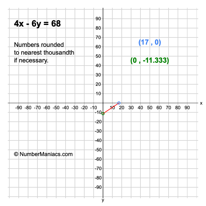 We will start by calculating and showing you the solution for the x-intercept and y-intercept of 4x - 6y = 68.
