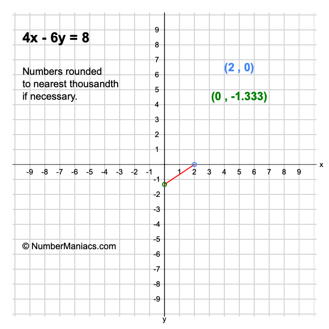 We will start by calculating and showing you the solution for the x-intercept and y-intercept of 4x - 6y = 8.