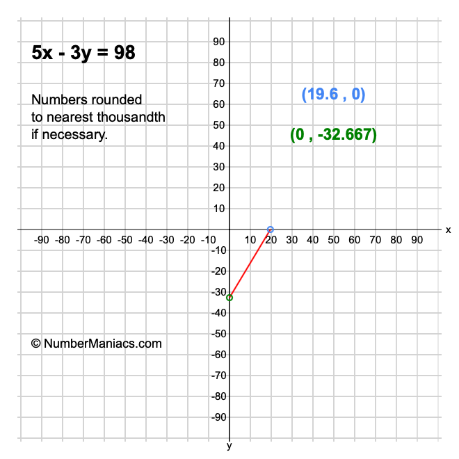 We will start by calculating and showing you the solution for the x-intercept and y-intercept of 5x - 3y = 98.