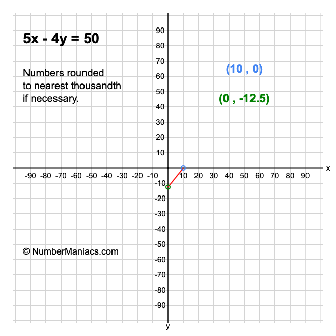 We will start by calculating and showing you the solution for the x-intercept and y-intercept of 5x - 4y = 50.