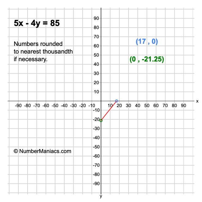 We will start by calculating and showing you the solution for the x-intercept and y-intercept of 5x - 4y = 85.
