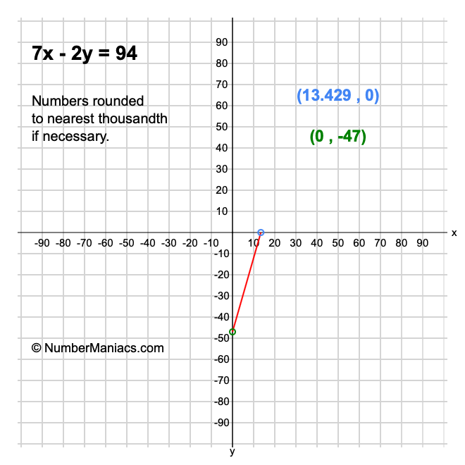 We will start by calculating and showing you the solution for the x-intercept and y-intercept of 7x - 2y = 94.