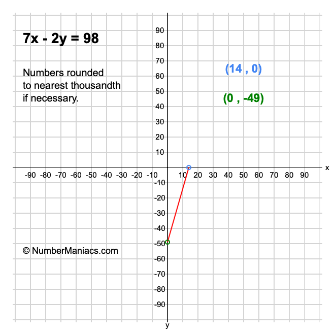 We will start by calculating and showing you the solution for the x-intercept and y-intercept of 7x - 2y = 98.