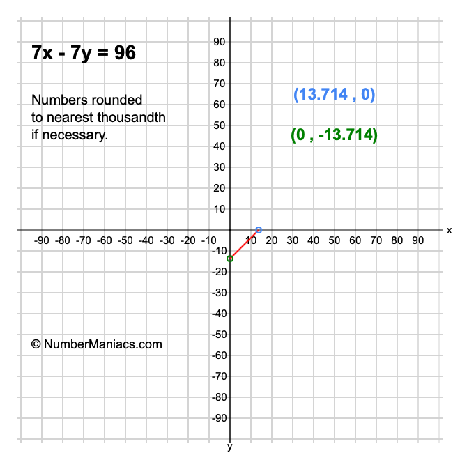We will start by calculating and showing you the solution for the x-intercept and y-intercept of 7x - 7y = 96.
