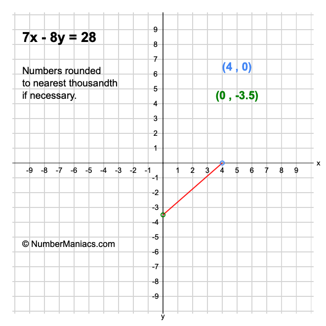 We will start by calculating and showing you the solution for the x-intercept and y-intercept of 7x - 8y = 28.