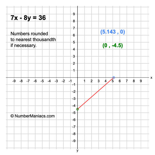 We will start by calculating and showing you the solution for the x-intercept and y-intercept of 7x - 8y = 36.