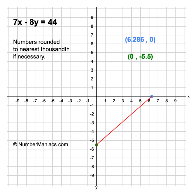 We will start by calculating and showing you the solution for the x-intercept and y-intercept of 7x - 8y = 44.