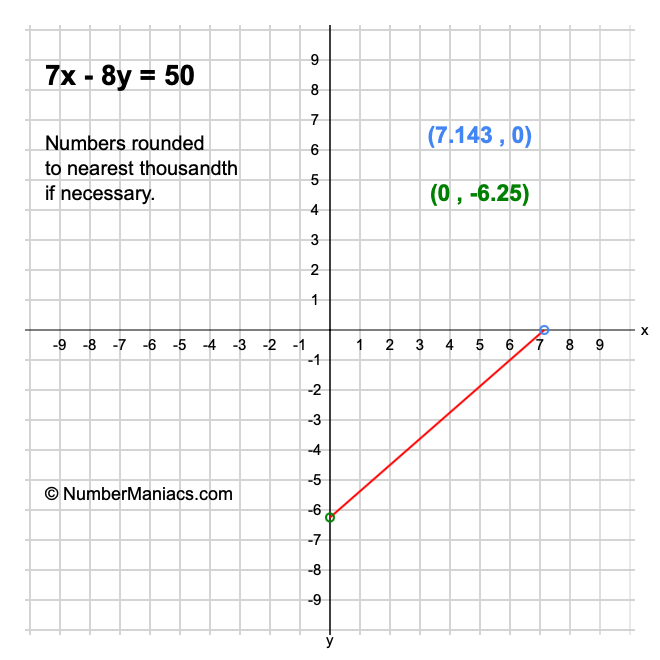 We will start by calculating and showing you the solution for the x-intercept and y-intercept of 7x - 8y = 50.