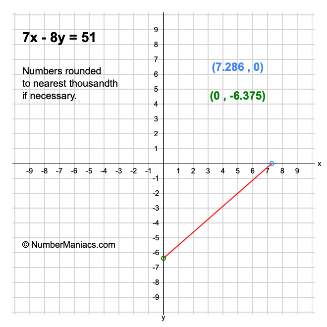 We will start by calculating and showing you the solution for the x-intercept and y-intercept of 7x - 8y = 51.