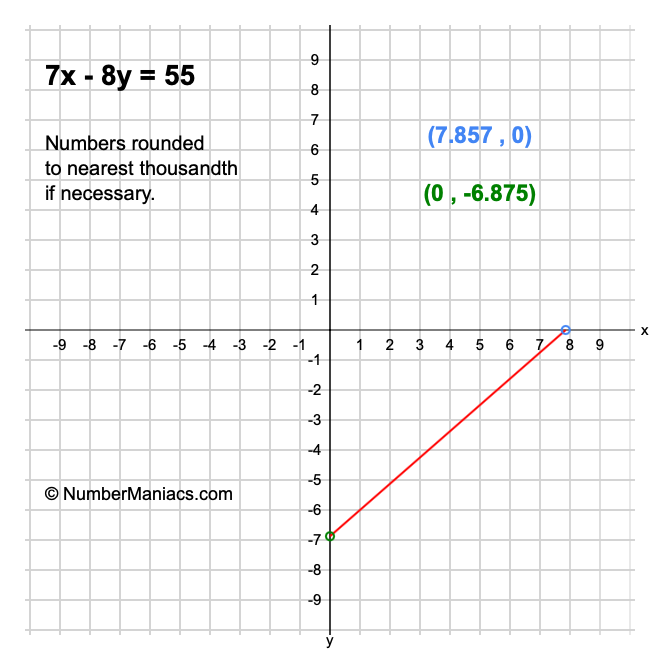 We will start by calculating and showing you the solution for the x-intercept and y-intercept of 7x - 8y = 55.
