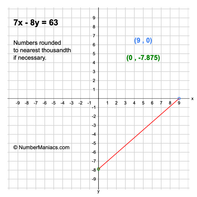 We will start by calculating and showing you the solution for the x-intercept and y-intercept of 7x - 8y = 63.