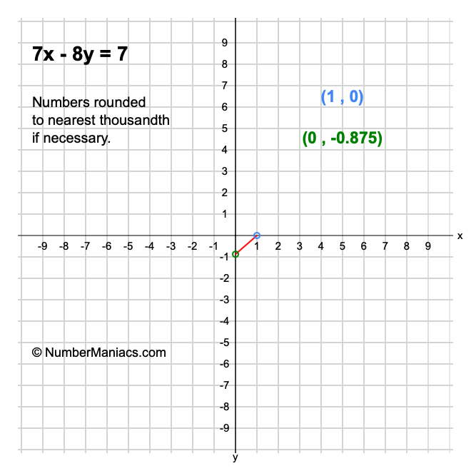 We will start by calculating and showing you the solution for the x-intercept and y-intercept of 7x - 8y = 7.