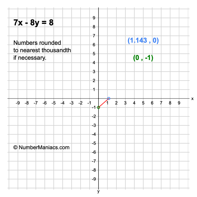 We will start by calculating and showing you the solution for the x-intercept and y-intercept of 7x - 8y = 8.
