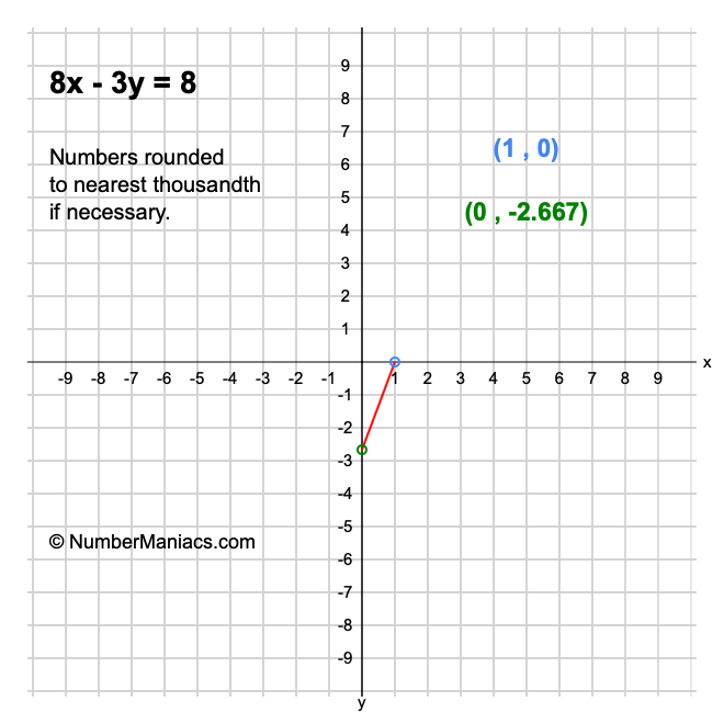 We will start by calculating and showing you the solution for the x-intercept and y-intercept of 8x - 3y = 8.