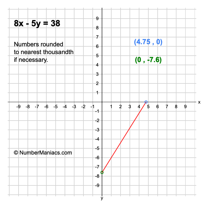 We will start by calculating and showing you the solution for the x-intercept and y-intercept of 8x - 5y = 38.