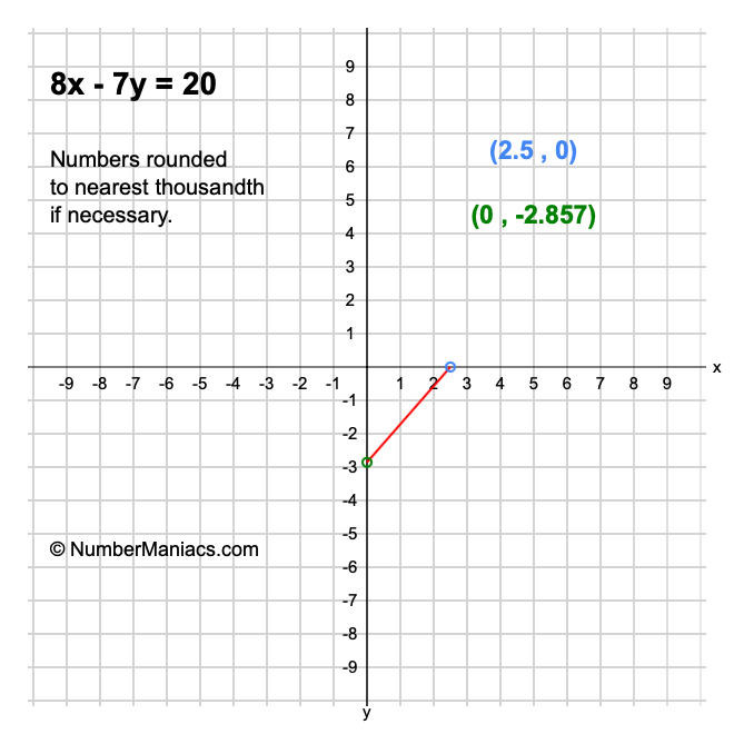 We will start by calculating and showing you the solution for the x-intercept and y-intercept of 8x - 7y = 20.