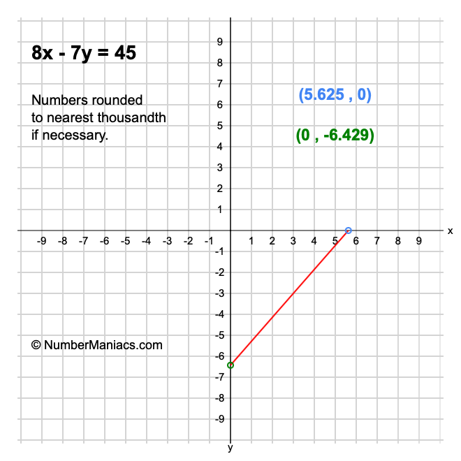We will start by calculating and showing you the solution for the x-intercept and y-intercept of 8x - 7y = 45.