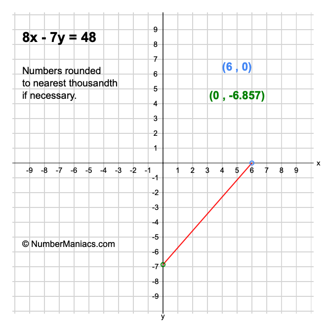 We will start by calculating and showing you the solution for the x-intercept and y-intercept of 8x - 7y = 48.
