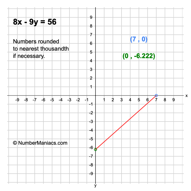 Thus, we use the x-intercept and y-intercept results above to get the graph plots for 8x - 9y = 56 as follows: