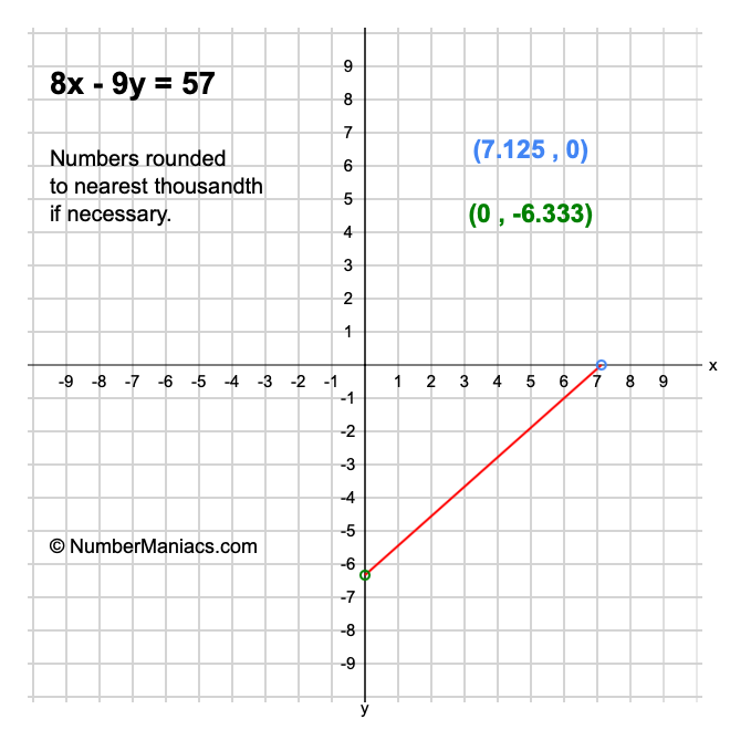 Thus, we use the x-intercept and y-intercept results above to get the graph plots for 8x - 9y = 57 as follows: