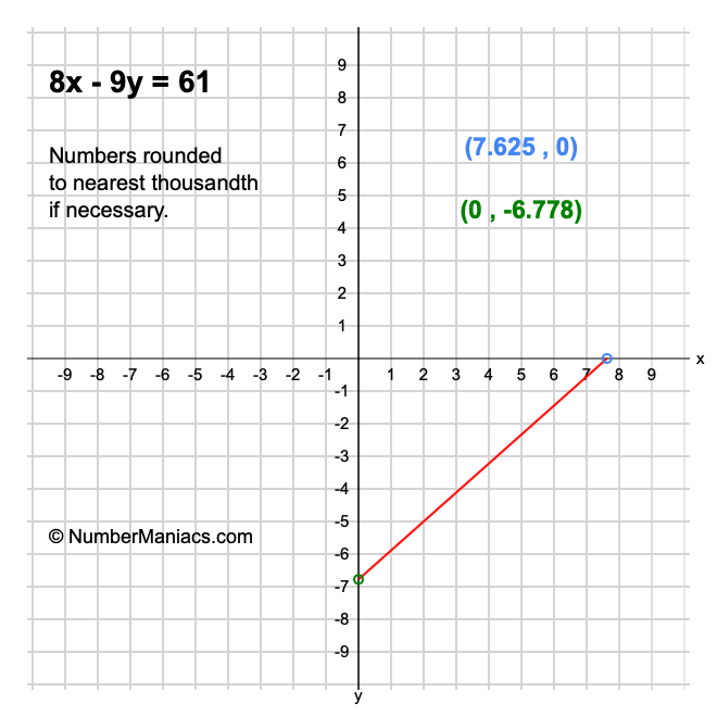 We will start by calculating and showing you the solution for the x-intercept and y-intercept of 8x - 9y = 61.