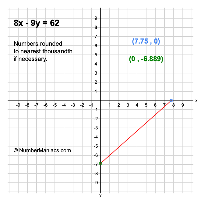 We will start by calculating and showing you the solution for the x-intercept and y-intercept of 8x - 9y = 62.