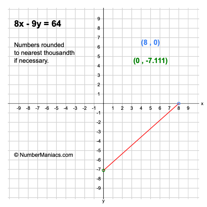 We will start by calculating and showing you the solution for the x-intercept and y-intercept of 8x - 9y = 64.