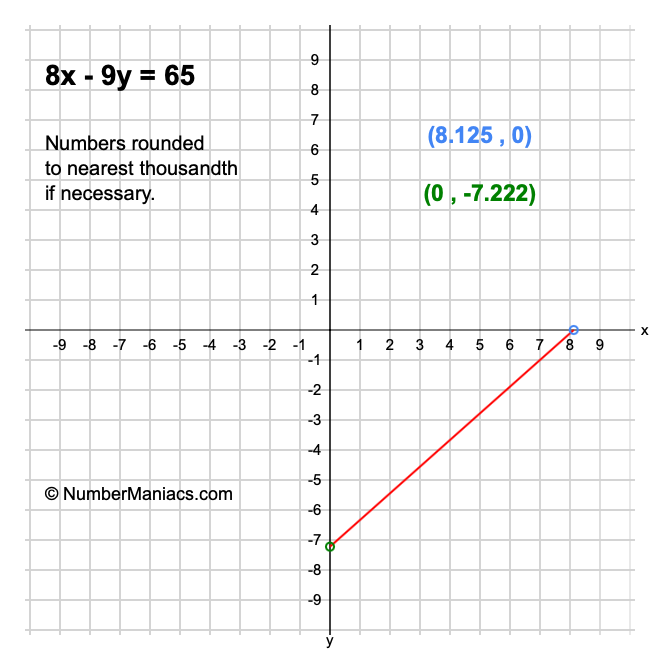 We will start by calculating and showing you the solution for the x-intercept and y-intercept of 8x - 9y = 65.