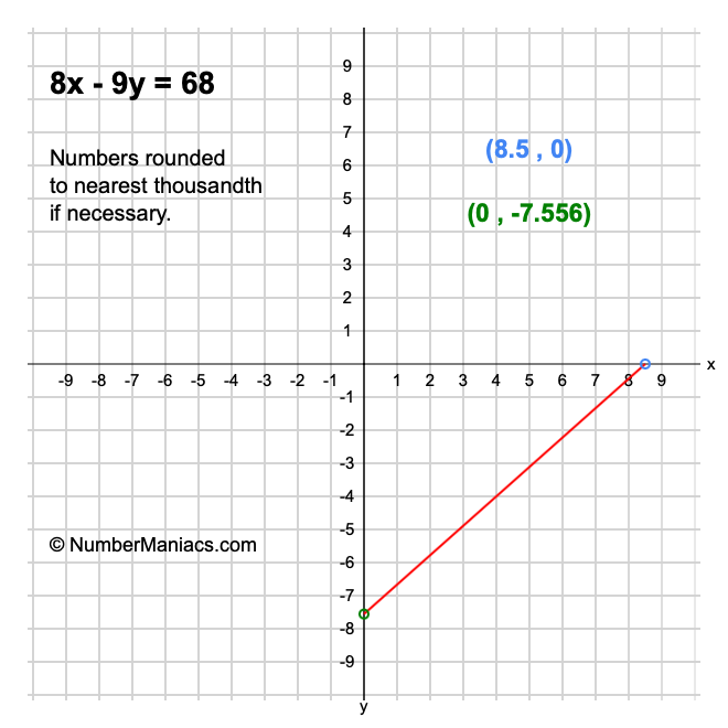 We will start by calculating and showing you the solution for the x-intercept and y-intercept of 8x - 9y = 68.