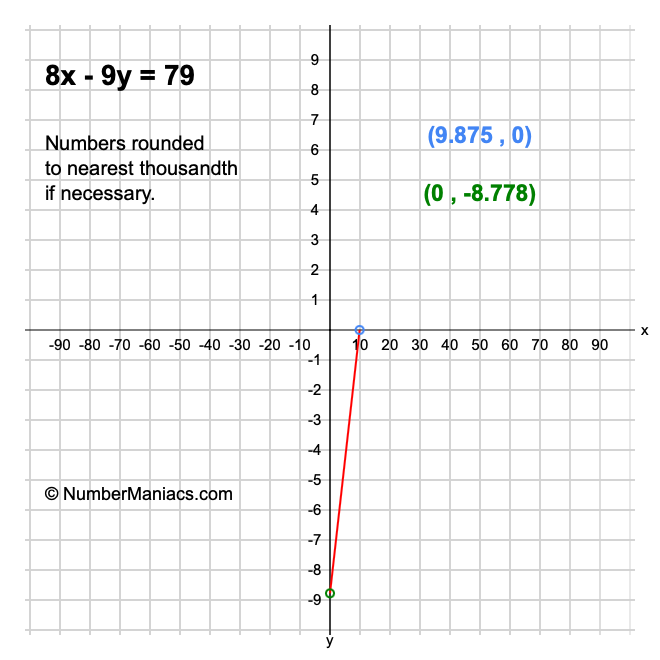 We will start by calculating and showing you the solution for the x-intercept and y-intercept of 8x - 9y = 79.