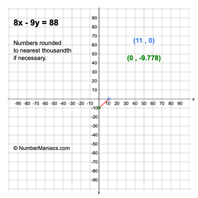 We will start by calculating and showing you the solution for the x-intercept and y-intercept of 8x - 9y = 88.