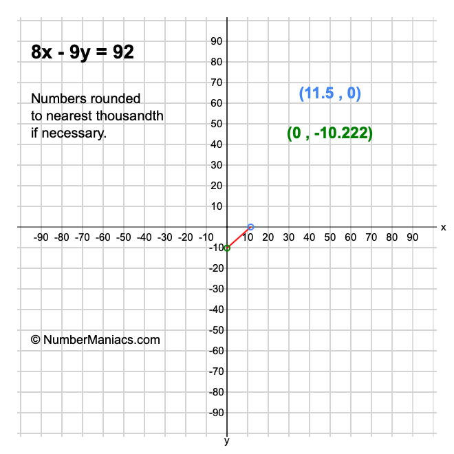 We will start by calculating and showing you the solution for the x-intercept and y-intercept of 8x - 9y = 92.