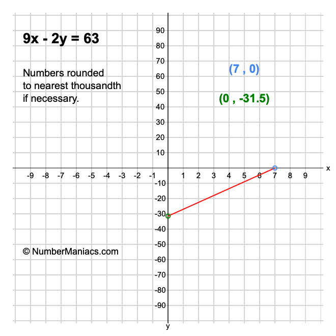 We will start by calculating and showing you the solution for the x-intercept and y-intercept of 9x - 2y = 63.