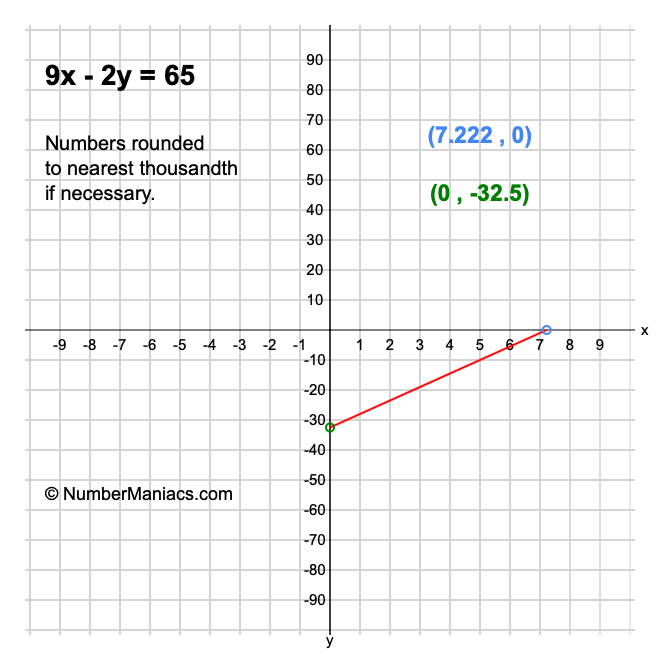 We will start by calculating and showing you the solution for the x-intercept and y-intercept of 9x - 2y = 65.