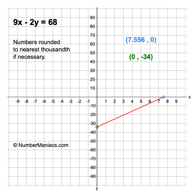 We will start by calculating and showing you the solution for the x-intercept and y-intercept of 9x - 2y = 68.