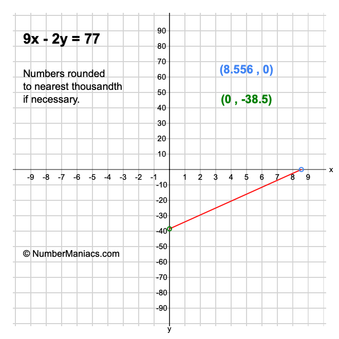 We will start by calculating and showing you the solution for the x-intercept and y-intercept of 9x - 2y = 77.