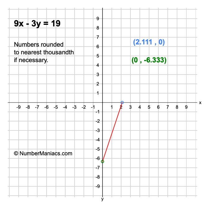 We will start by calculating and showing you the solution for the x-intercept and y-intercept of 9x - 3y = 19.