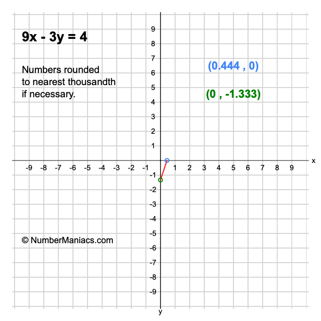 We will start by calculating and showing you the solution for the x-intercept and y-intercept of 9x - 3y = 4.