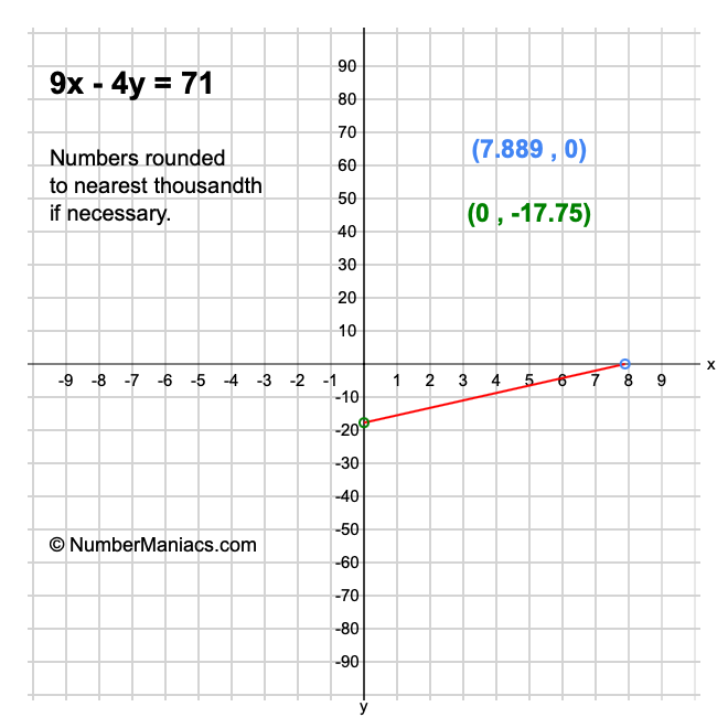 We will start by calculating and showing you the solution for the x-intercept and y-intercept of 9x - 4y = 71.