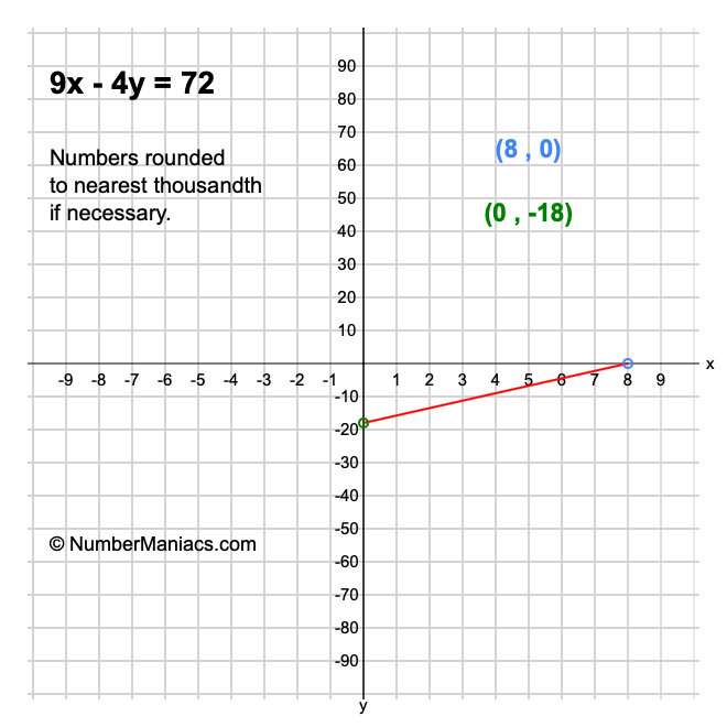 We will start by calculating and showing you the solution for the x-intercept and y-intercept of 9x - 4y = 72.